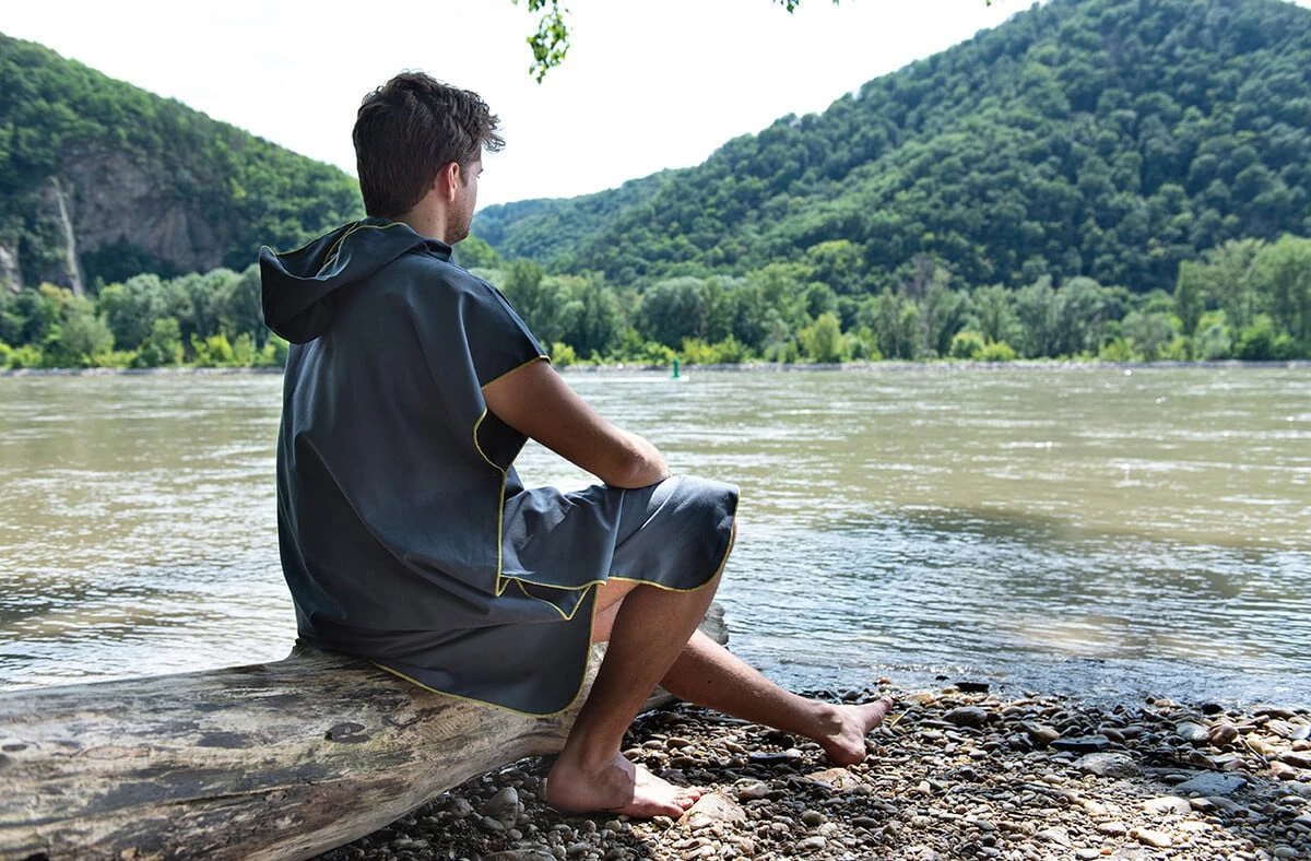 Der Poncho ist seitlich mit Druckknöpfen zu verschließen und bietet nach dem Abtrocknen Wärme und Privatsphäre zum Umkleiden.