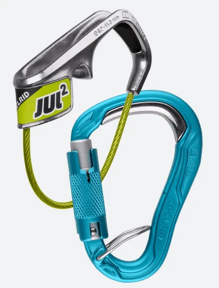 Das Jul 2 Belay Kit Bulletproof bietet dir ein Sicherungsgerät mit Bremsunterstützung und einen passenden Karabiner, der an der Einbindeschlaufe fixiert werden kann und durch sein Material extrem robust ist. An der abriebintensivsten Stelle des Karabiner ist hier Stahl verbaut.