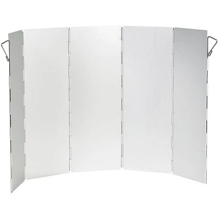 5fach faltbarer Aluwindschirm mit Stahlstiften im Boden fixierbar.