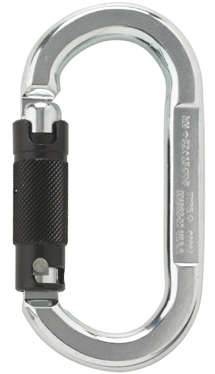 Ovaler Stahlkarabiner mit 3-Wege-Verschluss und sehr hohen Bruchlastwerten für entsprechende Anwendungen.